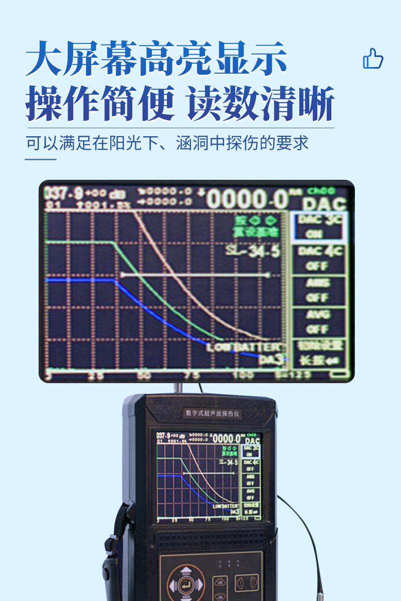 大屏幕高亮顯示,可以滿足在陽光下、涵洞中探傷的要求。