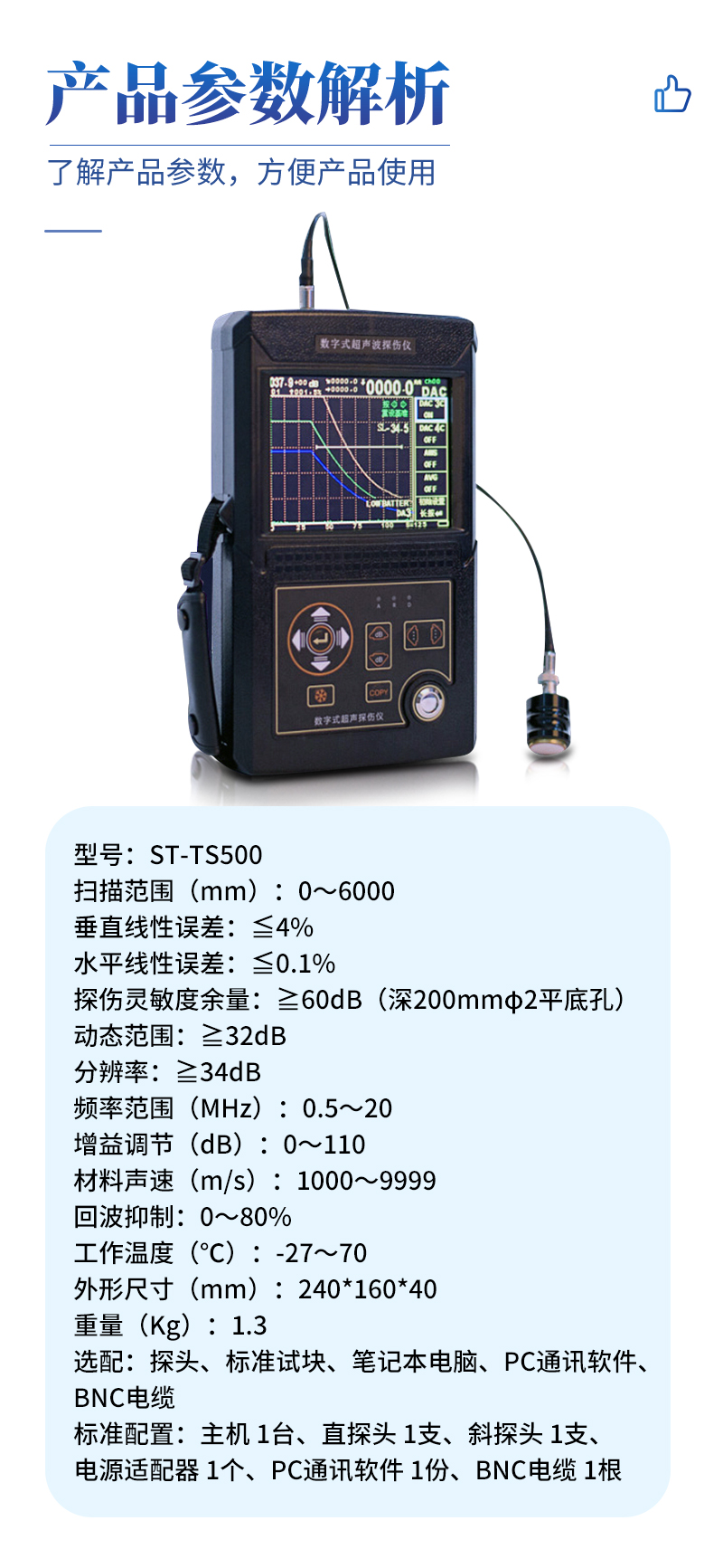 選配 | 探頭、標準試塊、筆記本電腦、PC通訊軟件、BNC電纜 |